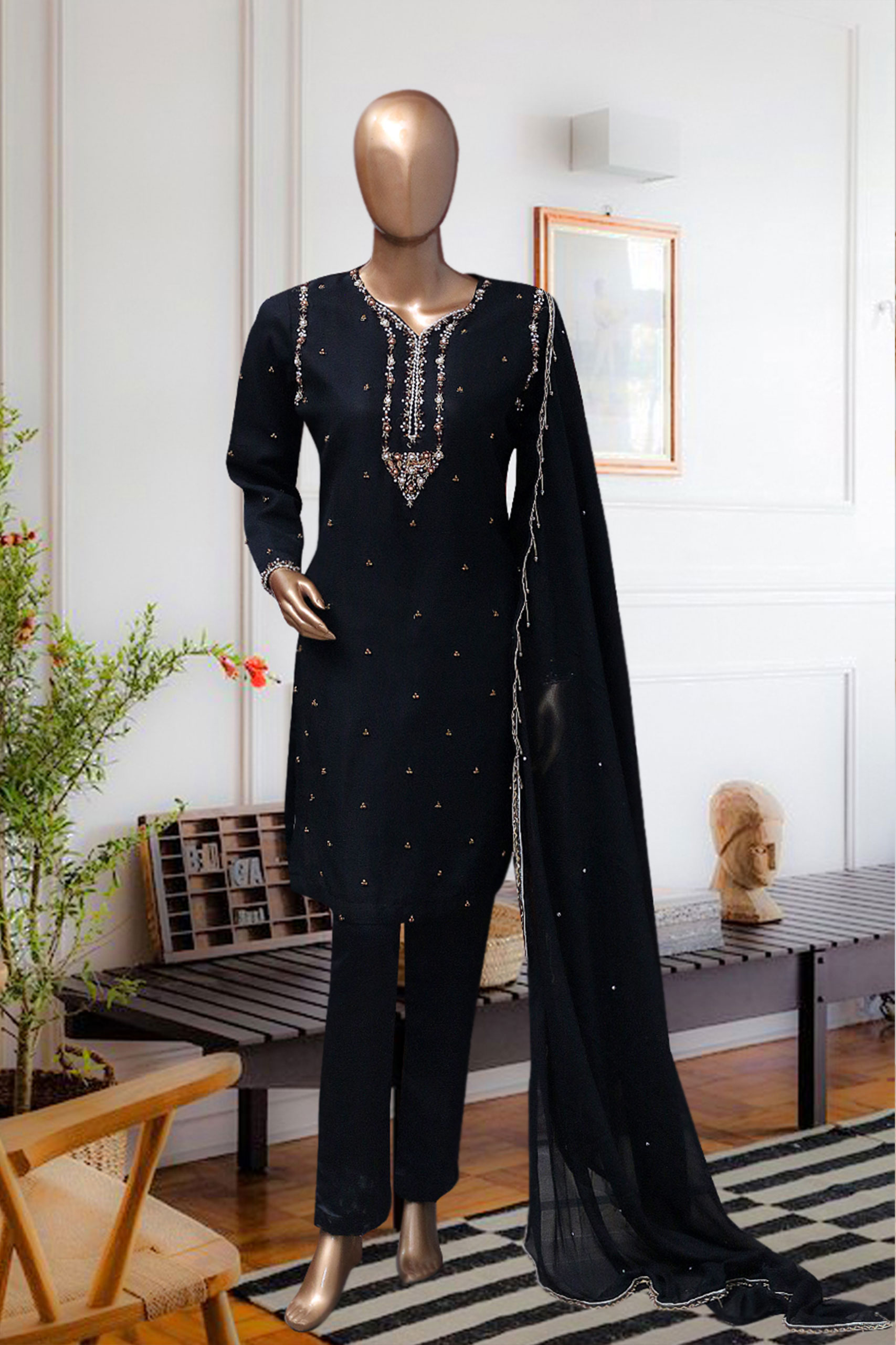 Draped in sophistication, this exquisite black outfit is adorned with intricate embellishments, creating the perfect blend of grace and glamour. Whether it’s a festive occasion or an evening soirée, this ensemble is crafted to make you stand out effortlessly.