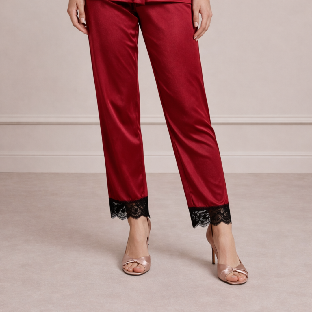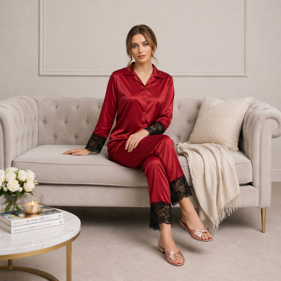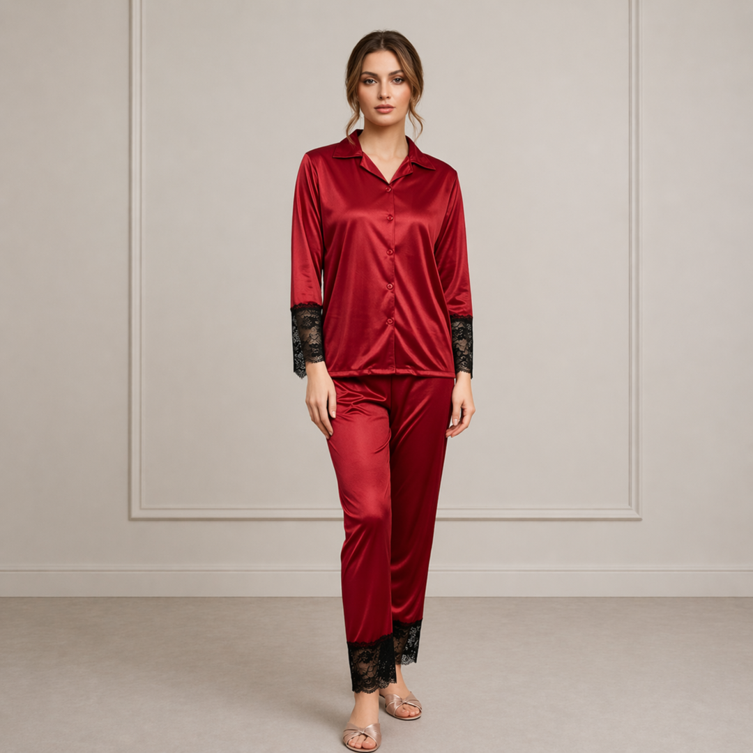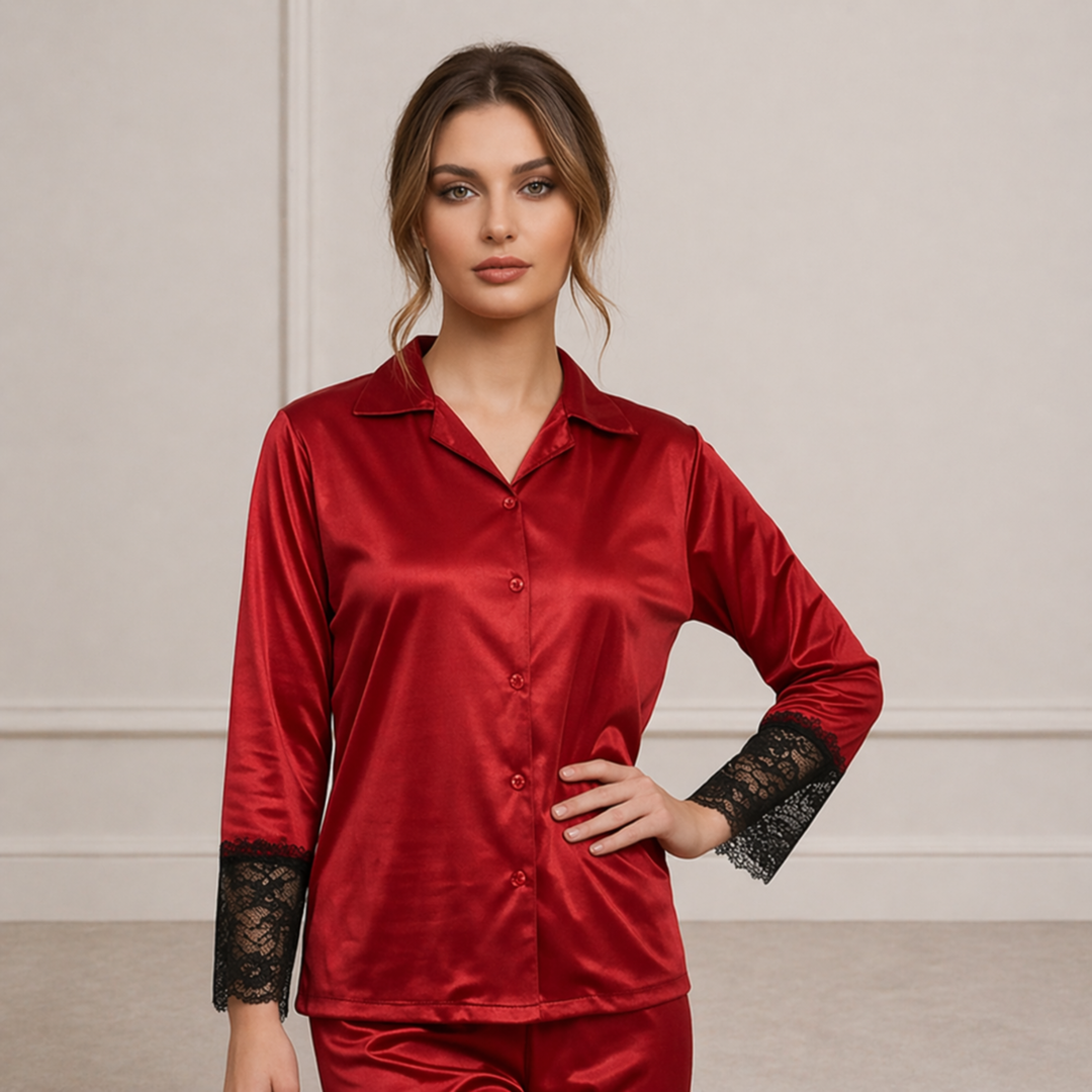This stylish set includes a long-sleeve button-down shirt and matching straight-fit pajama pants. The shirt is designed with a classic collar and front button closure, offering a refined and versatile look that can also be worn as lounge wear during the day. The smooth jersey fabric drapes beautifully on the body, giving a flattering silhouette without feeling tight or restrictive.