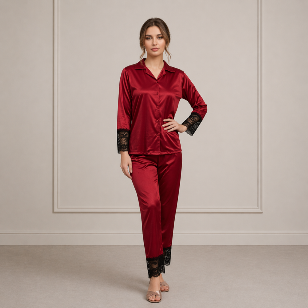 The deep maroon color adds a touch of sophistication and timeless beauty, making it an ideal choice for women who love rich, elegant tones in their nightwear collection. Whether you are relaxing at home, enjoying a cozy evening, or preparing for a restful night’s sleep, this night suit ensures you look graceful while feeling completely comfortable.