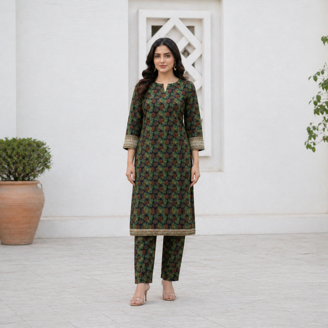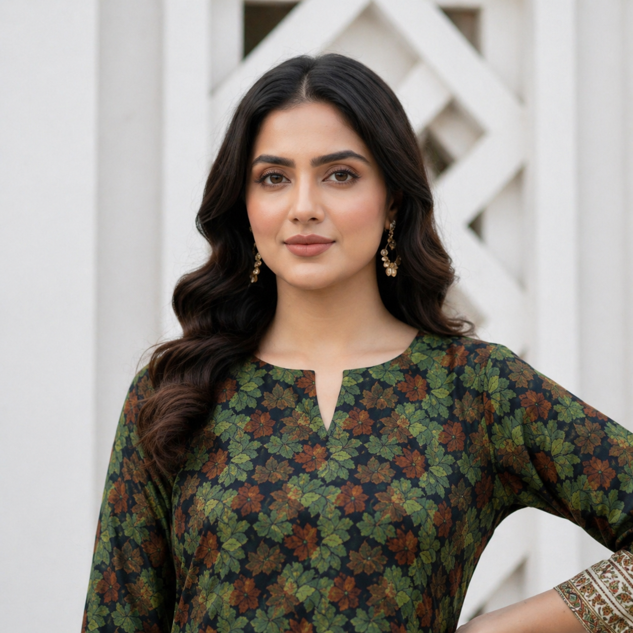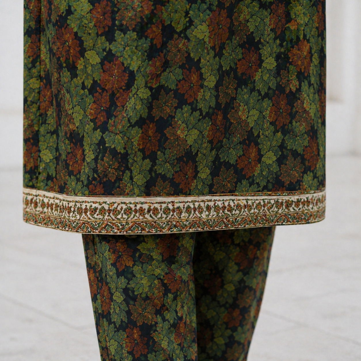 What truly sets this outfit apart is its beautifully executed digital print. The design features an intricate blend of earthy greens and warm tones, forming a subtle yet captivating pattern that reflects nature-inspired elegance. Digital printing ensures precision in every detail, resulting in sharp, vibrant patterns that retain their quality even after multiple washes. The print is evenly distributed across both the kurta and trousers, creating a cohesive and well-balanced look that speaks of understated luxury.