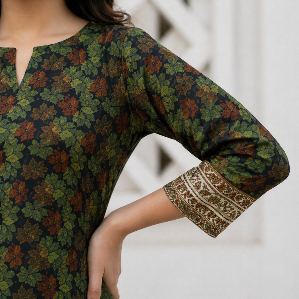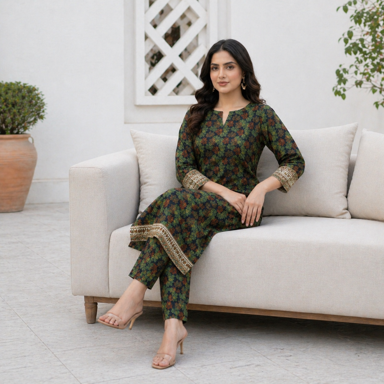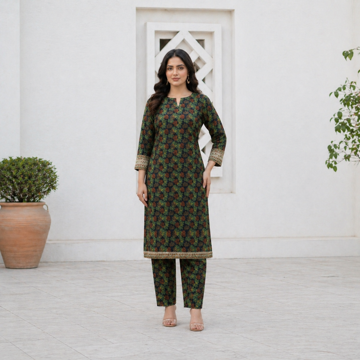 What truly sets this outfit apart is its beautifully executed digital print. The design features an intricate blend of earthy greens and warm tones, forming a subtle yet captivating pattern that reflects nature-inspired elegance. Digital printing ensures precision in every detail, resulting in sharp, vibrant patterns that retain their quality even after multiple washes. The print is evenly distributed across both the kurta and trousers, creating a cohesive and well-balanced look that speaks of understated luxury.