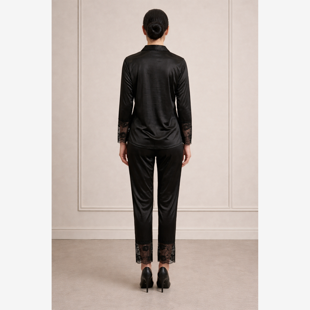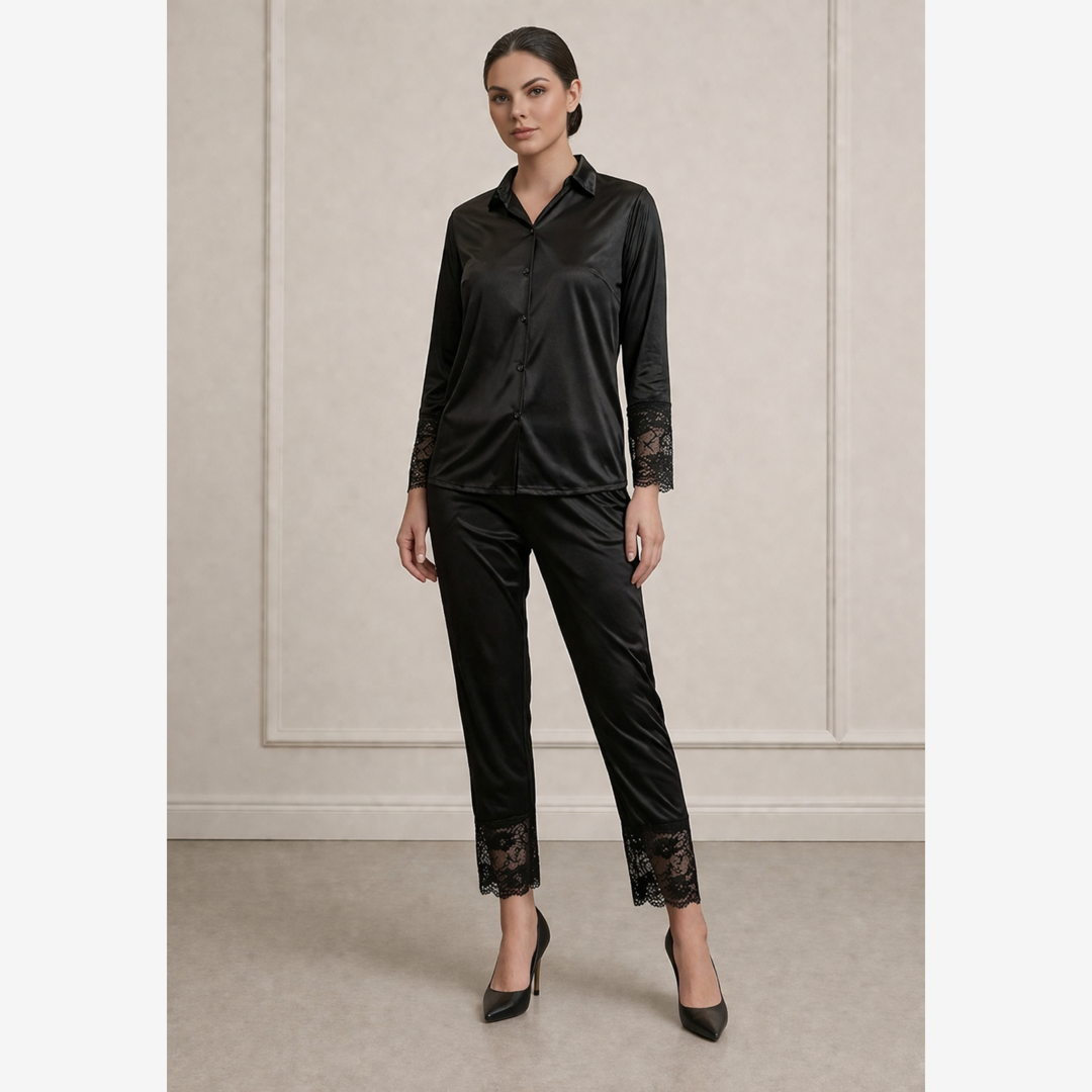 The button-down shirt is thoughtfully designed for both style and convenience. Its relaxed fit allows easy movement, while the structured collar and clean stitching give it a polished finish. The matching trousers are tailored to provide a comfortable yet flattering silhouette, with a fit that complements all body types. The lace accents add just the right amount of charm, making you feel confident and stylish even at home.