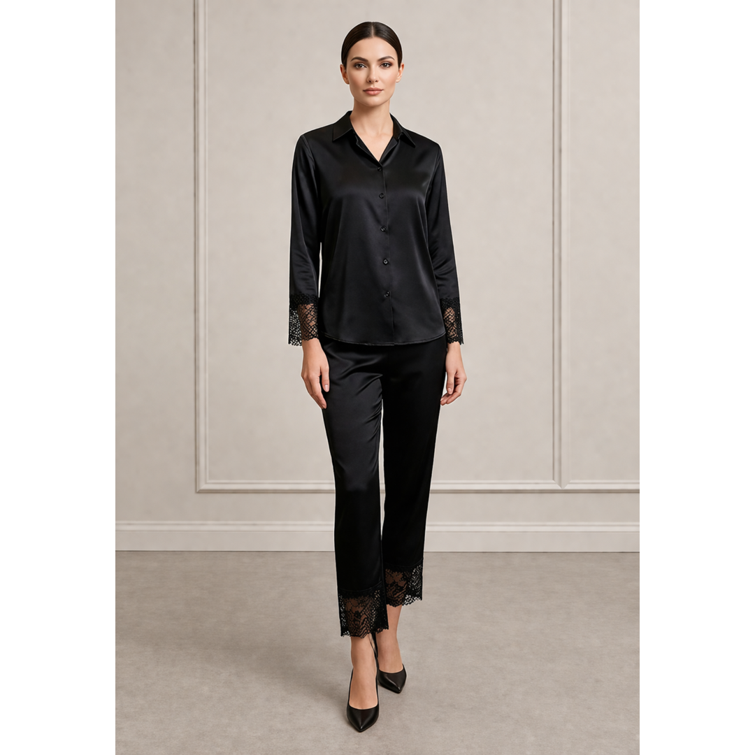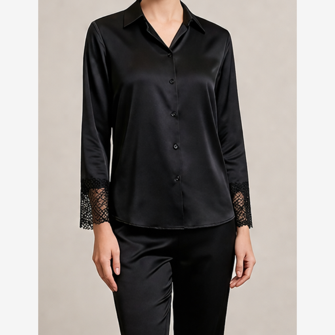 The top features a classic button-down design with a tailored fit that enhances your natural silhouette. Its minimal yet refined look is perfect for women who prefer understated luxury. The delicate lace detailing on the sleeves adds a touch of femininity and elegance, giving the outfit a stylish edge without compromising comfort.