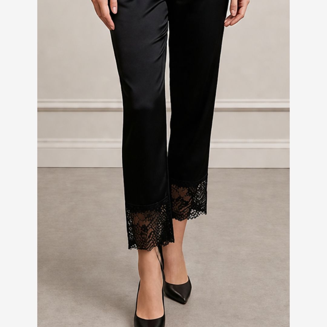 Paired with matching Jersey trousers, this set is designed to provide both flexibility and style. The pants offer a relaxed fit with lace accents at the hem, creating a cohesive and polished look. The lightweight fabric allows for easy movement, ensuring you feel comfortable whether you’re lounging, sleeping, or simply enjoying some “me time.”