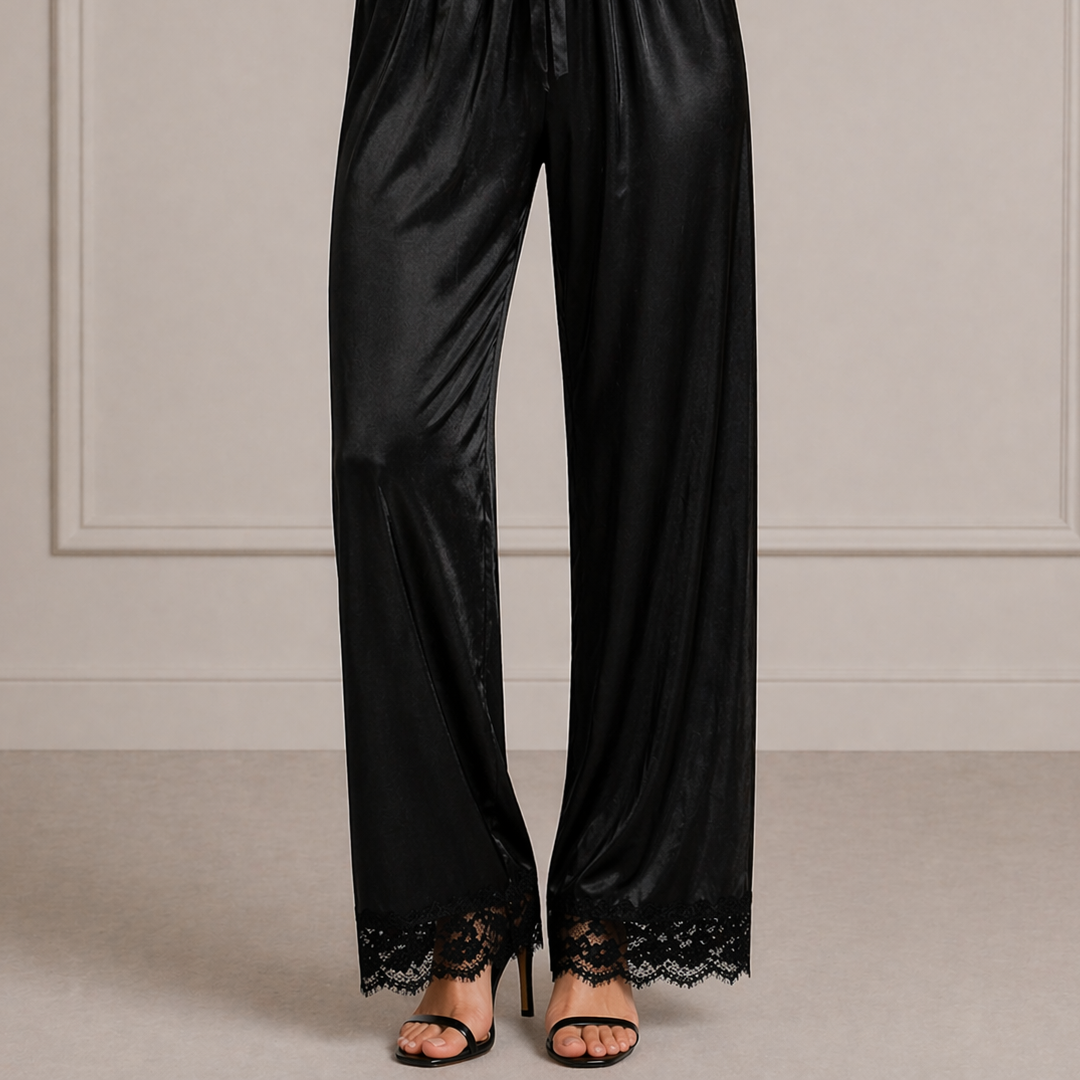 The trousers complete the set with their relaxed fit and practical design. Featuring an elastic waistband, they provide a secure yet flexible fit, ensuring all-night comfort. The soft jersey fabric ensures ease of movement, while the subtle lace accents at the hem create a polished and coordinated look. These trousers are ideal for both sleeping and lounging, offering versatility and style in one piece.