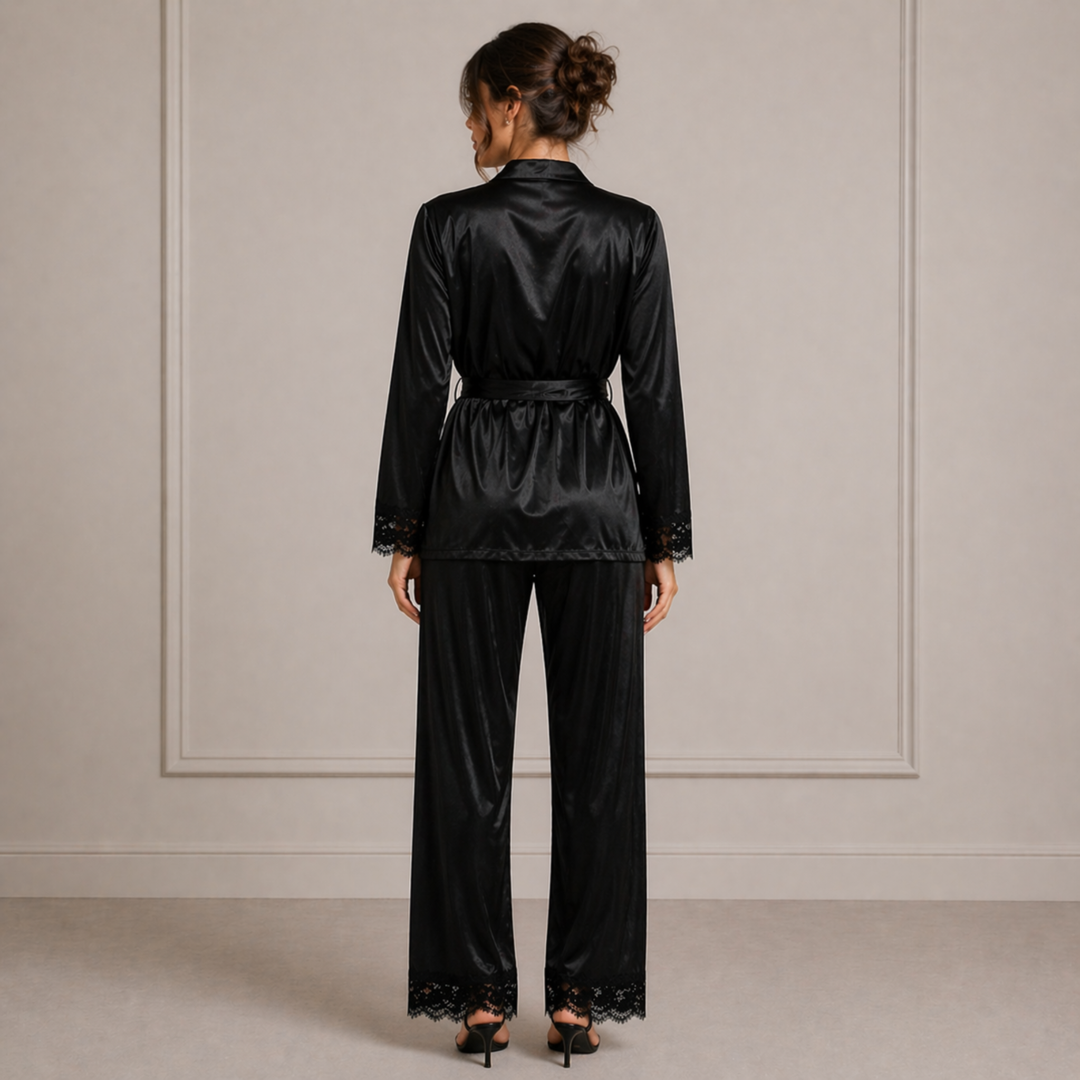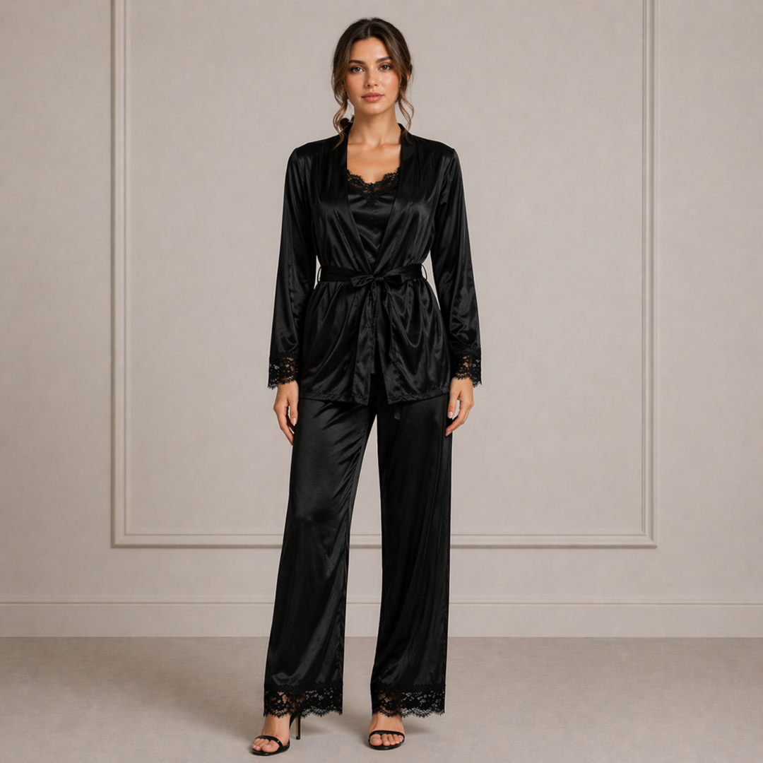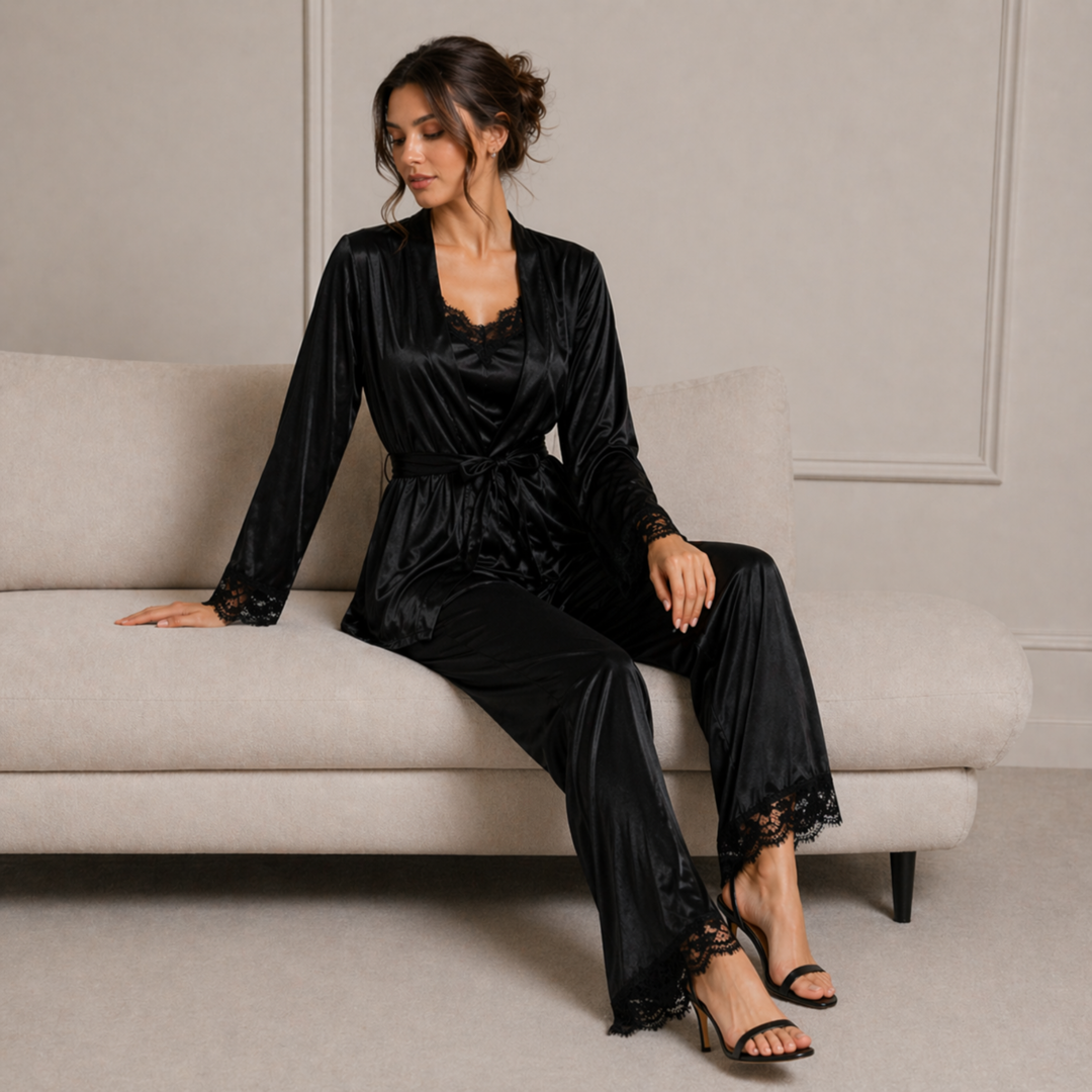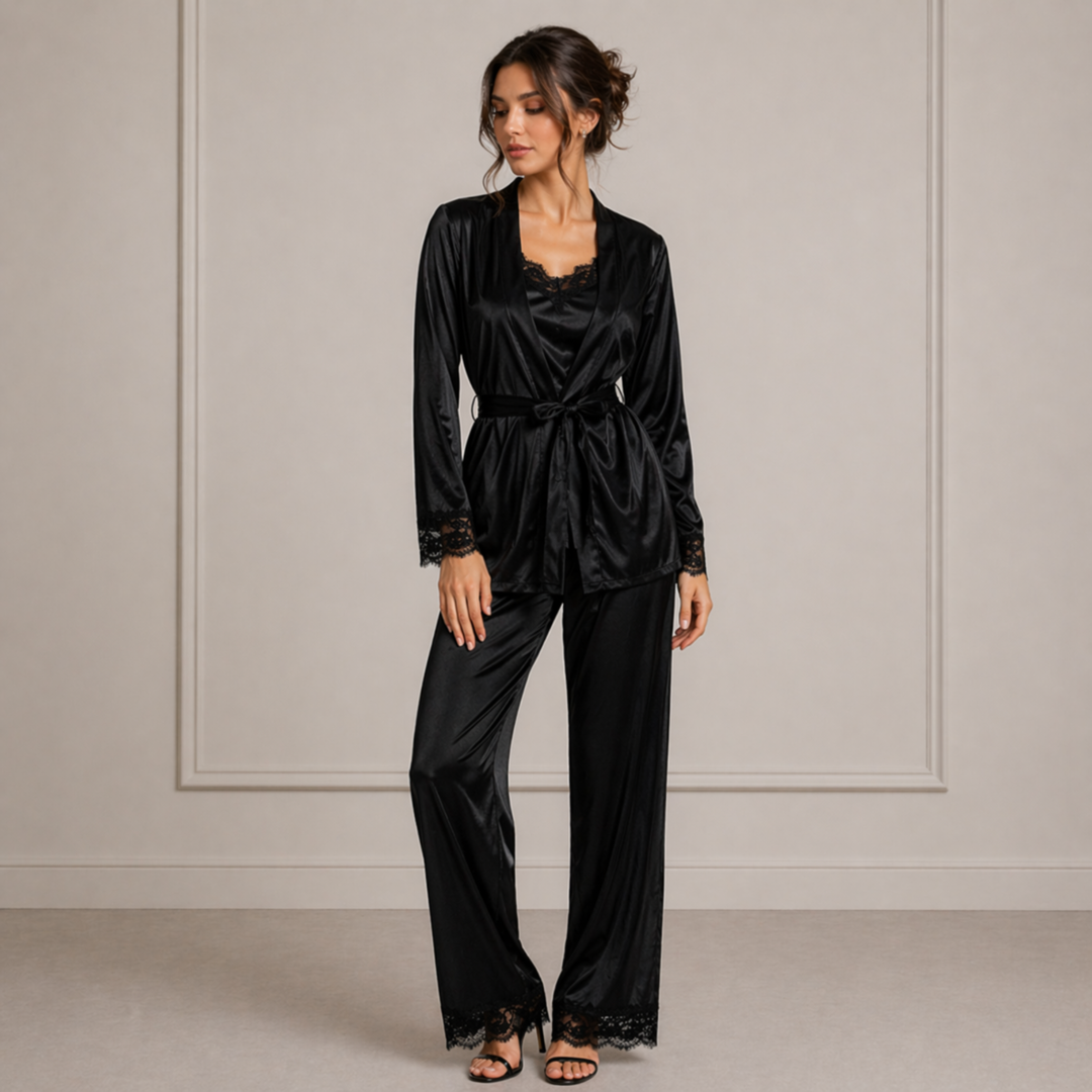 This elegant set includes three perfectly coordinated pieces—a stylish inner top, a comfortable pair of trousers, and a matching outer robe. Each piece is thoughtfully designed to complement the others, creating a cohesive and luxurious look that elevates your nightwear collection.