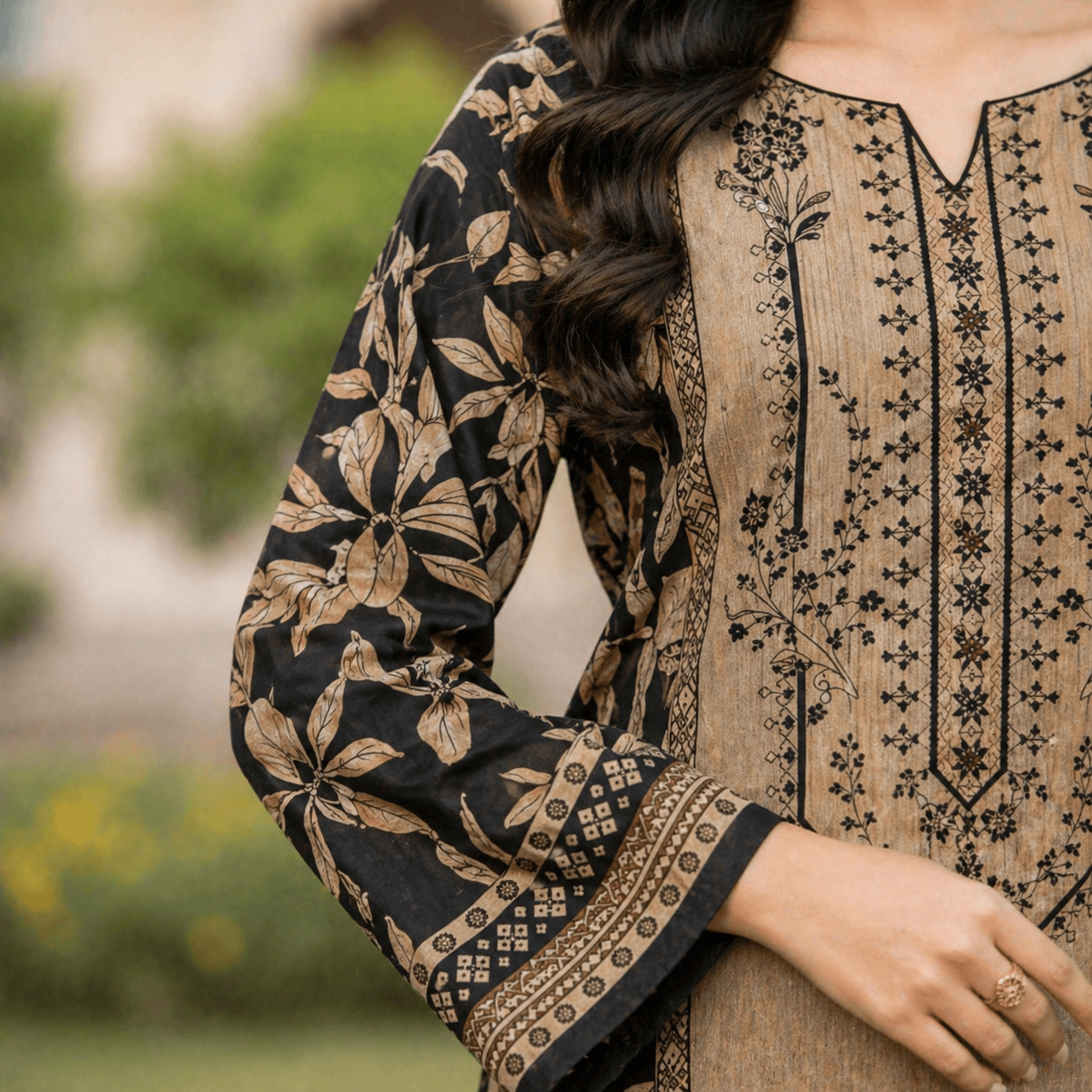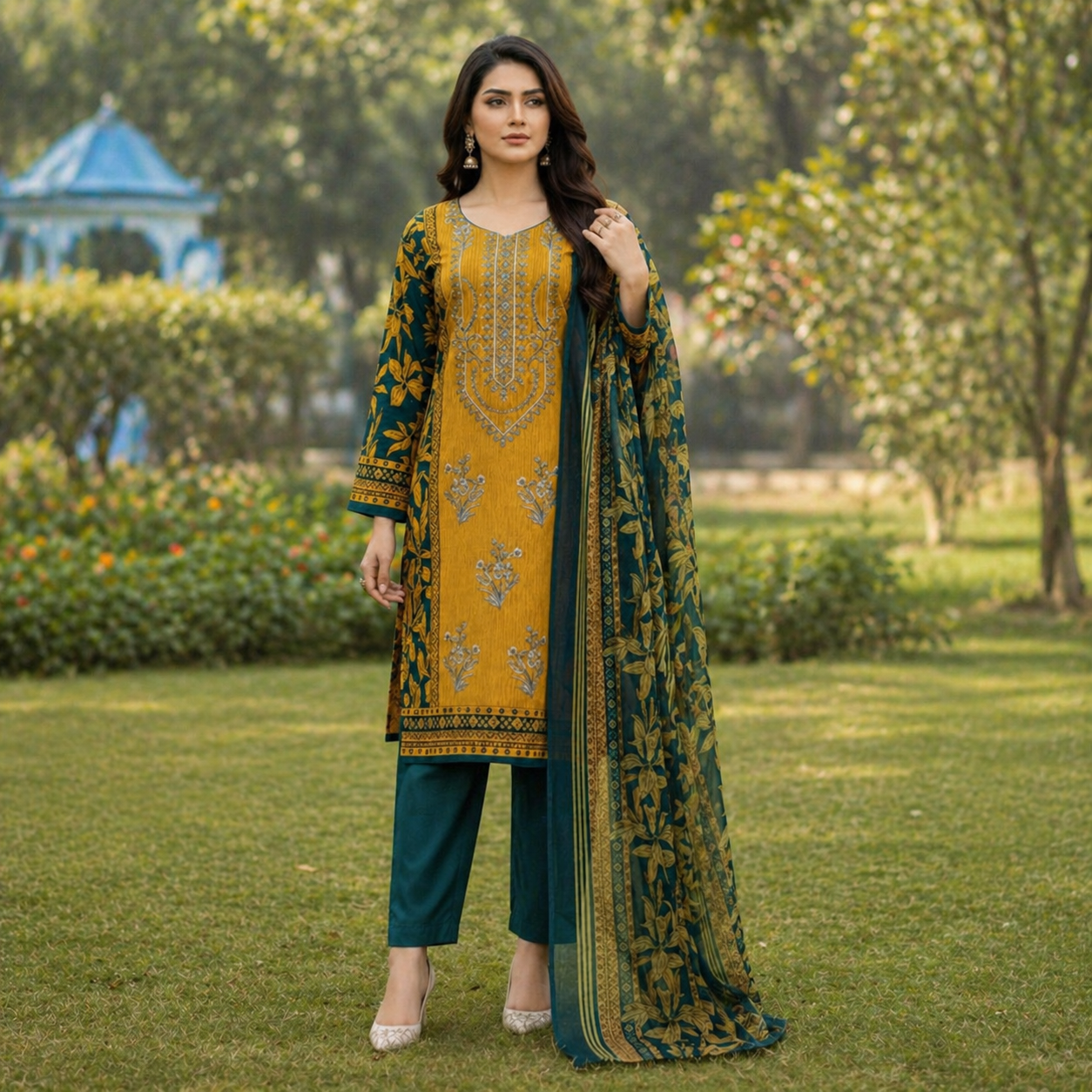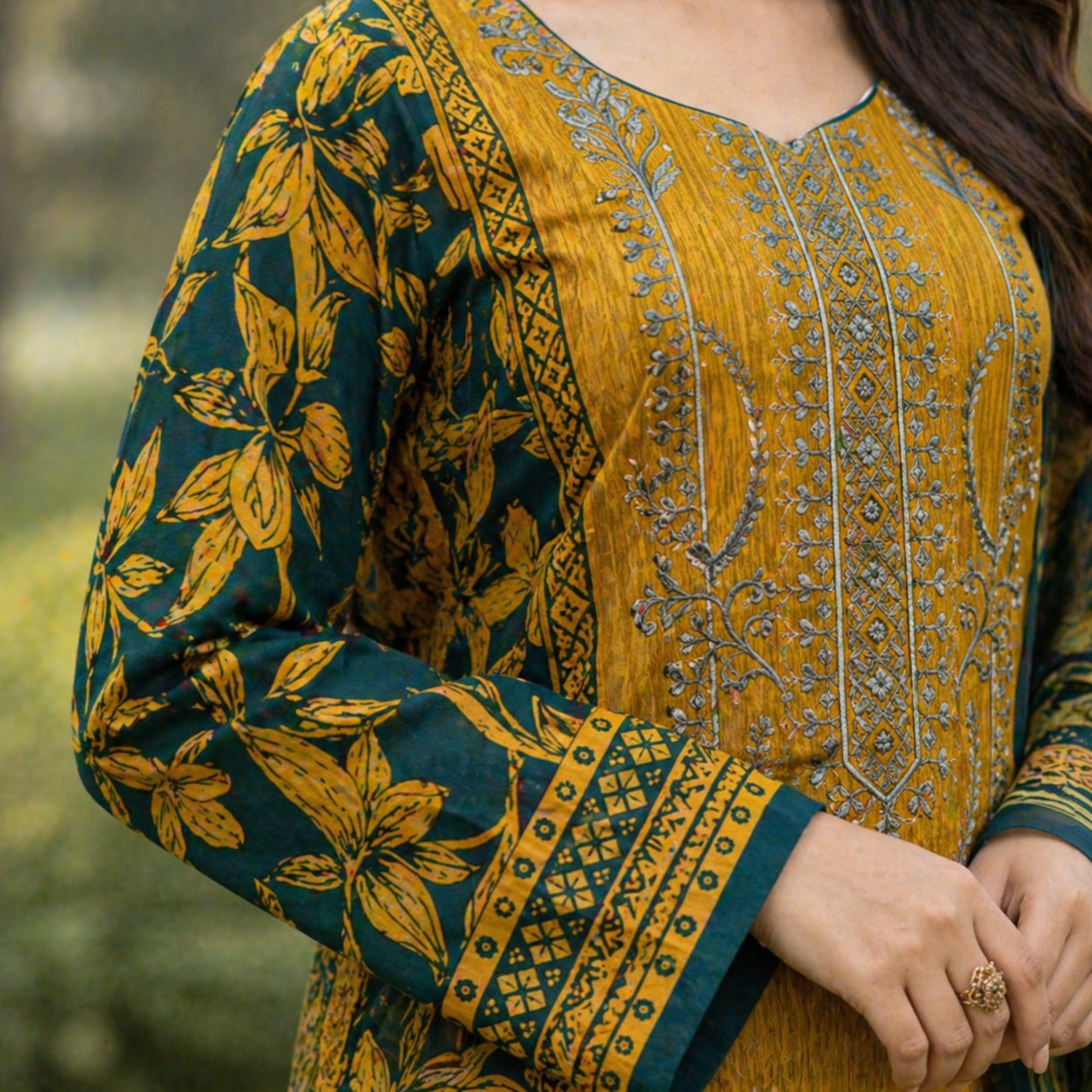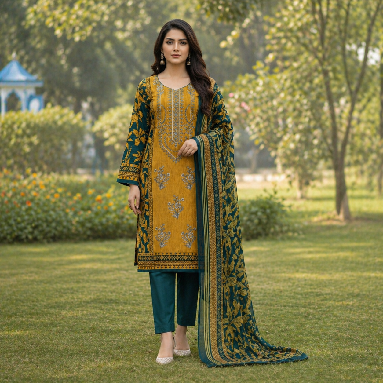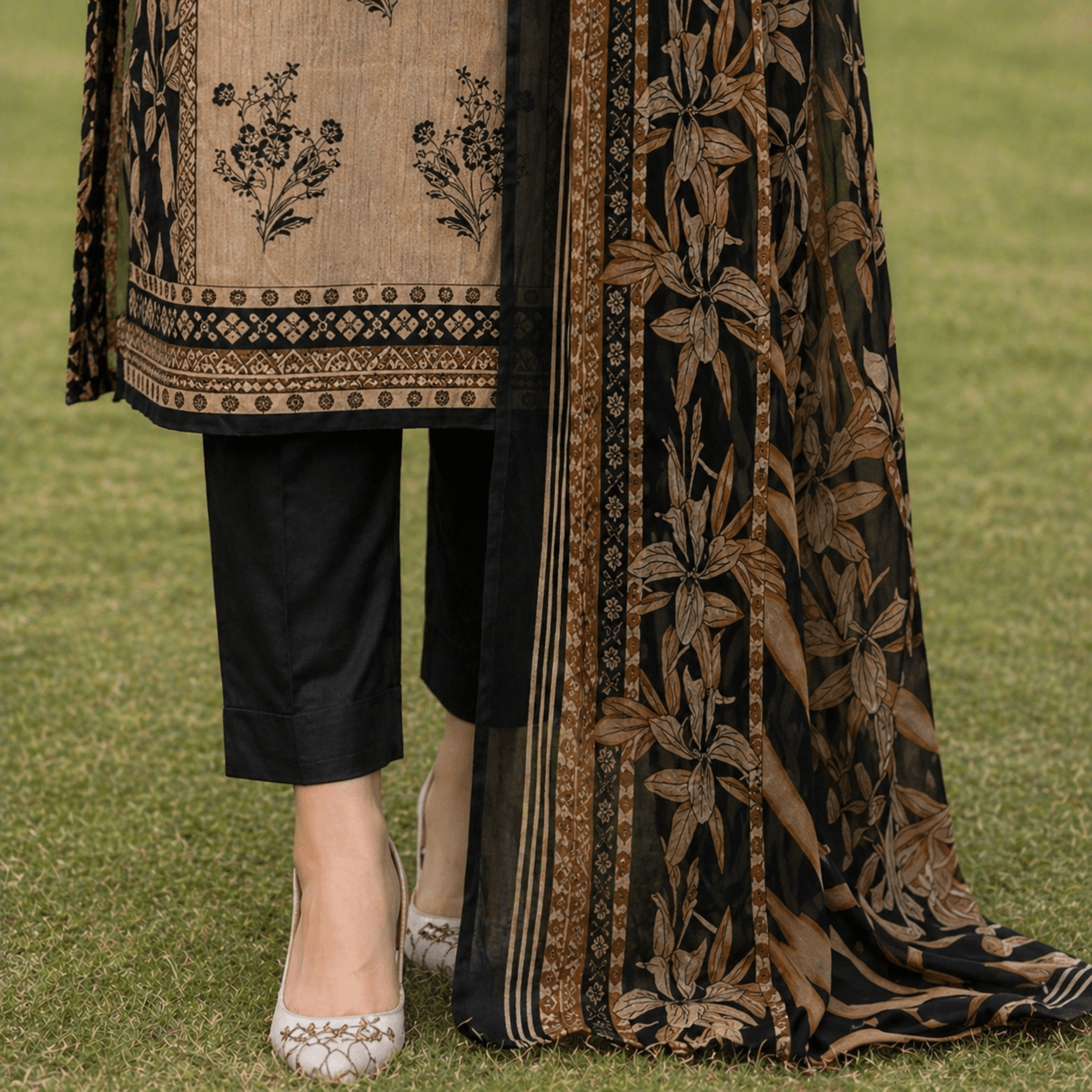 The printed base complements the embroidery beautifully, creating a harmonious blend of textures and patterns. This thoughtful combination ensures that the outfit remains versatile, making it suitable for both casual and semi-formal occasions.