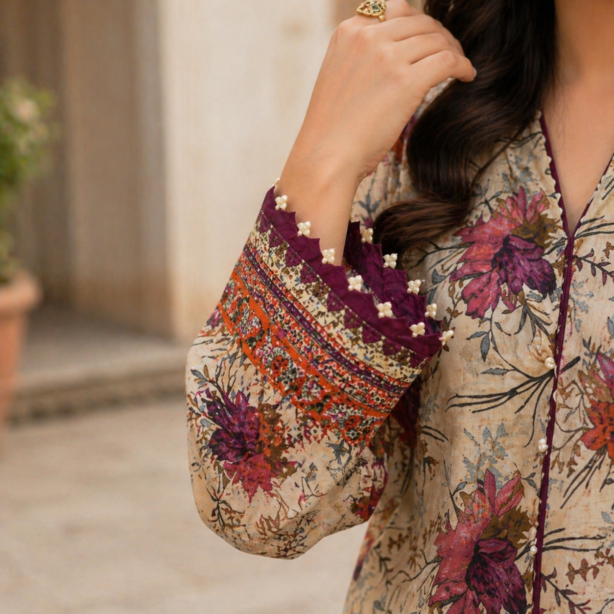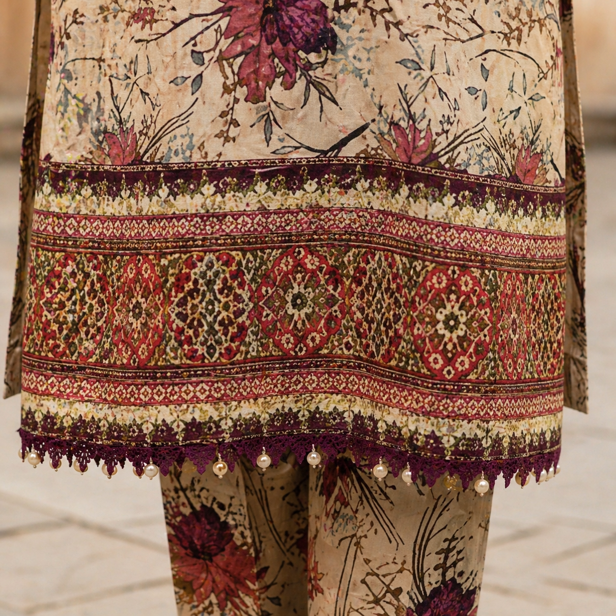 The shirt fabric features a finely detailed printed neckline design that mimics traditional embroidery, giving it a luxurious feel without compromising comfort. The sleeves are enhanced with elegant printed borders that add depth and character to the overall outfit. Every detail in this design is thoughtfully curated to ensure you stand out with subtle sophistication rather than loud embellishments.