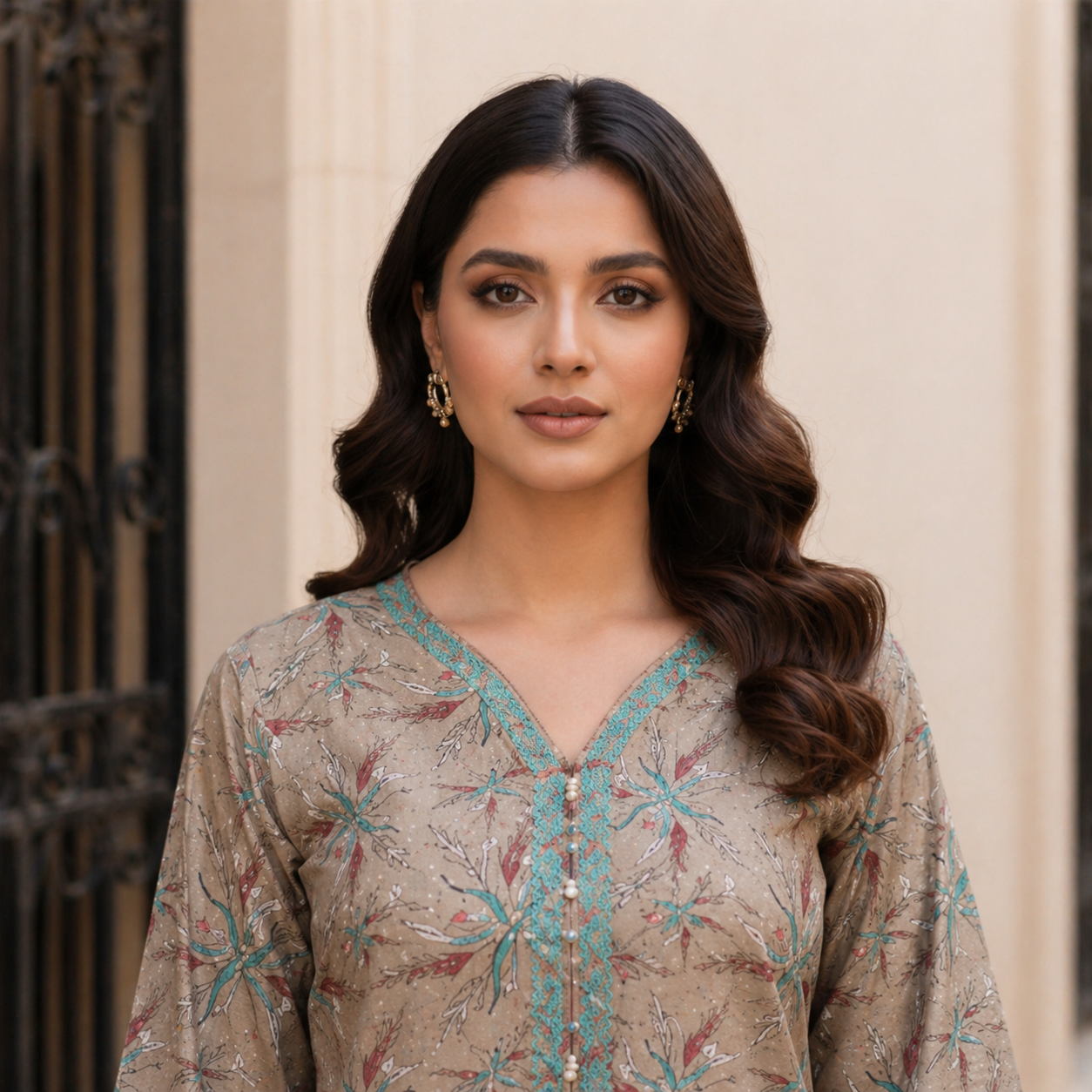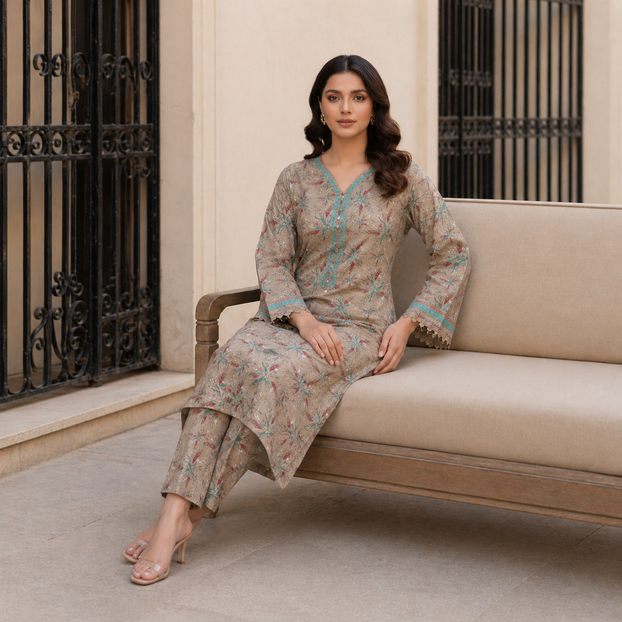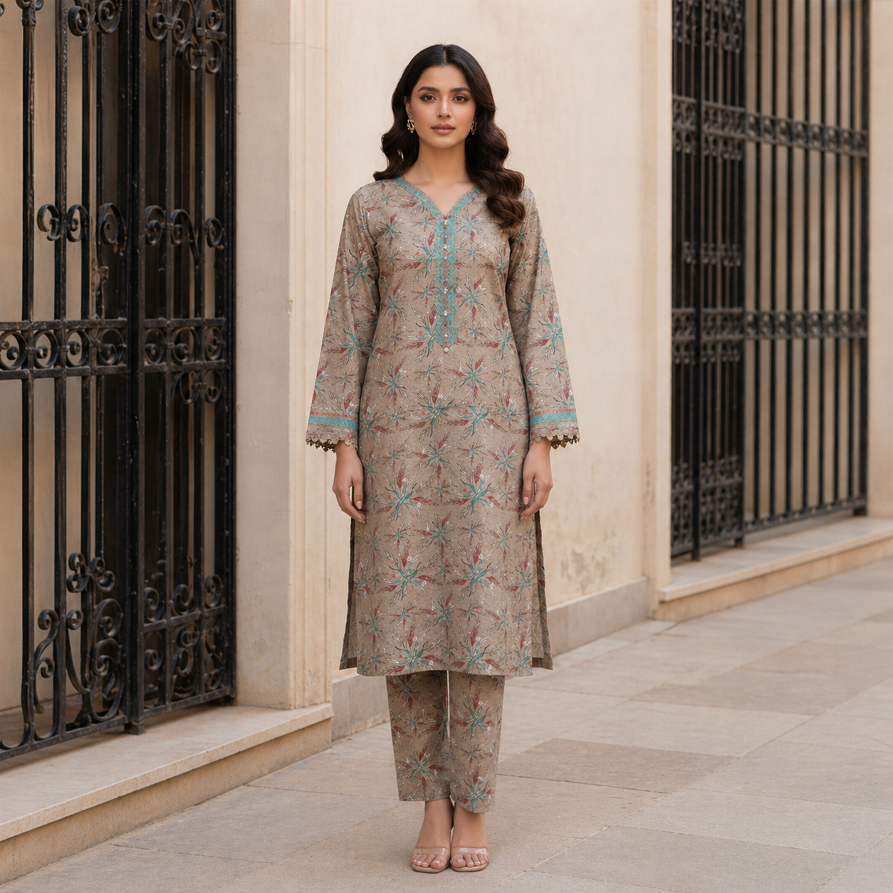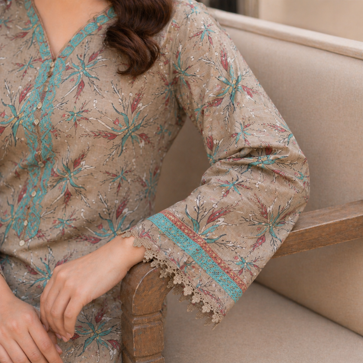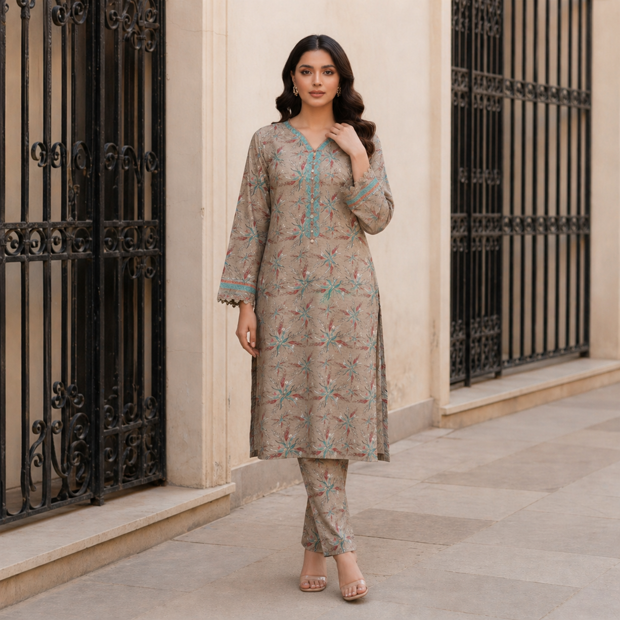 What truly sets this suit apart is its thoughtfully designed print. Inspired by nature and modern minimalism, the subtle floral patterns are beautifully arranged across a soft, earthy-toned base. The delicate interplay of colors creates a soothing visual appeal that is both graceful and contemporary. The neckline area is enhanced with intricate printed detailing, giving the shirt a semi-formal look that can easily transition from daywear to evening elegance.
