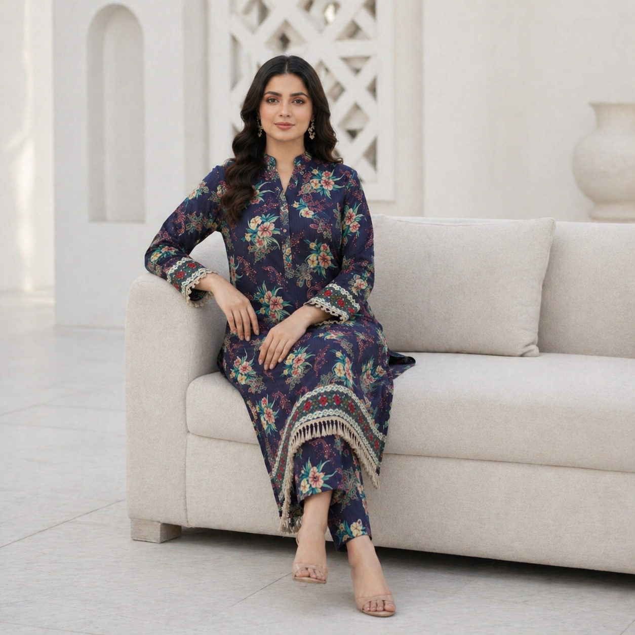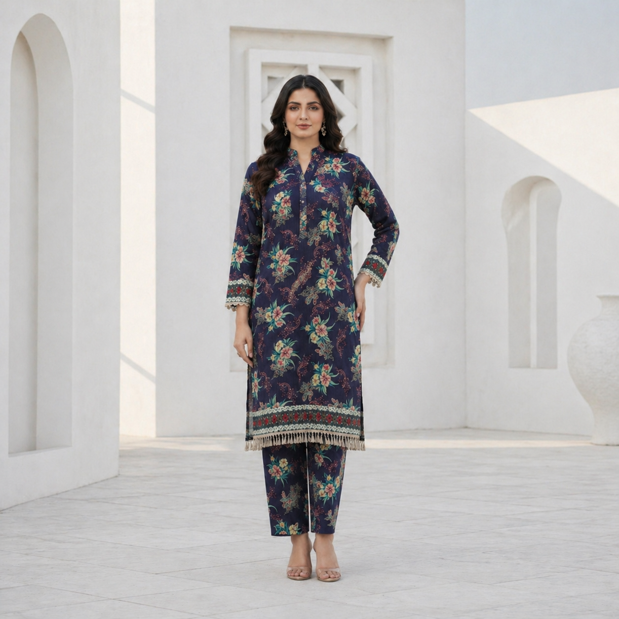 The deep navy blue base of this suit exudes elegance and timeless charm. It serves as the perfect canvas for the beautifully arranged floral patterns in soft hues of green, beige, and muted red. These delicate floral motifs bring a refreshing and feminine touch to the outfit, making it suitable for both casual and semi-formal occasions.