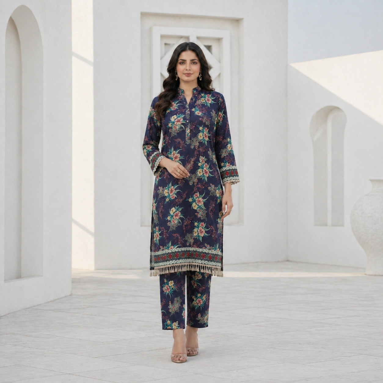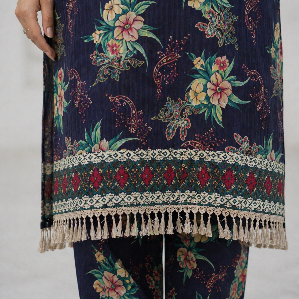 The shirt features an all-over floral print that is thoughtfully balanced to create a visually appealing look. The neckline is designed in a modest and versatile style, allowing you to customize it according to your stitching preferences. The sleeves are enhanced with detailed printed borders, adding a hint of sophistication, while the hemline is finished with a decorative border and subtle fringe detailing that elevates the entire design.