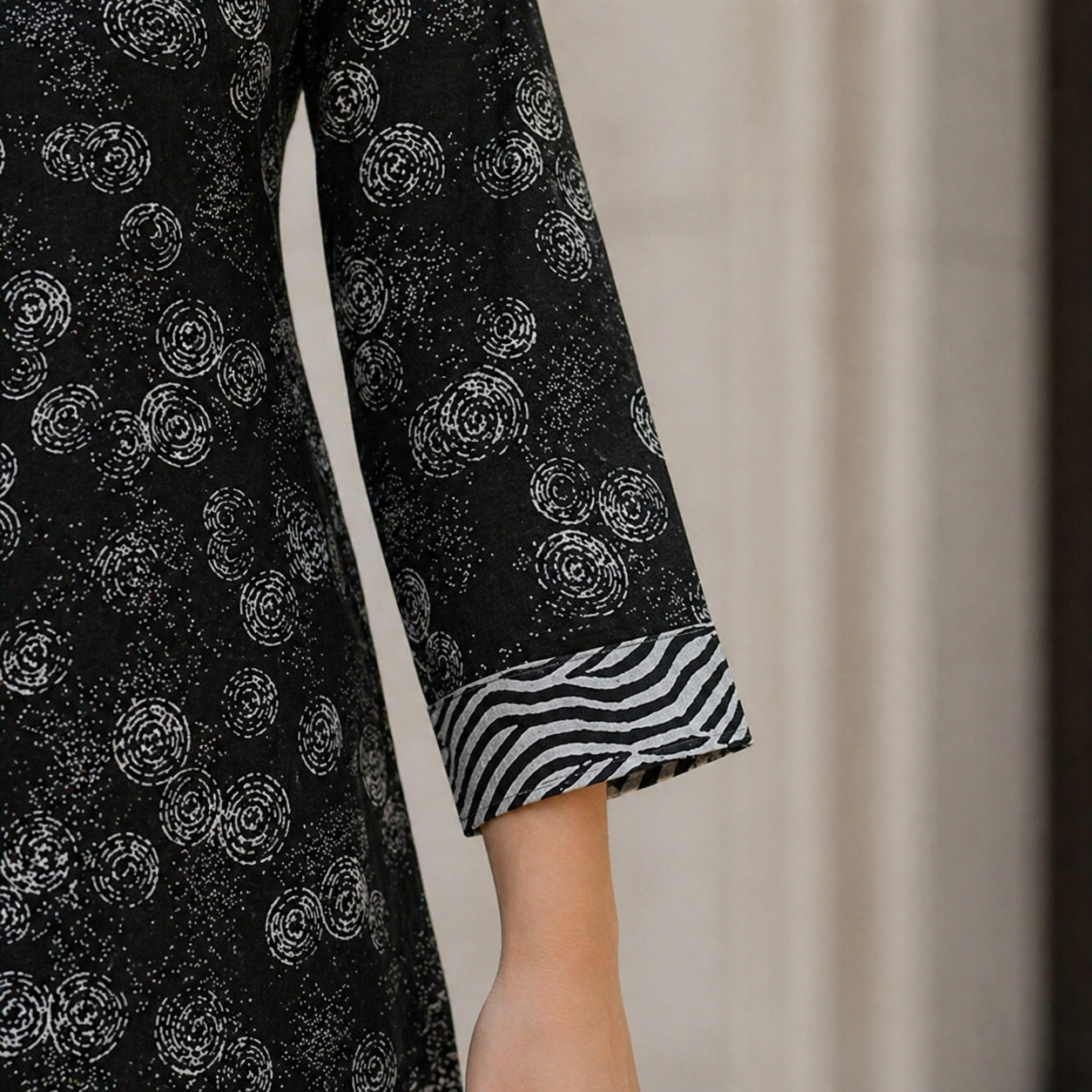 The sleeves are designed with a modern touch, featuring printed cuff detailing that adds character to the outfit. This small yet impactful design element elevates the overall look, giving it a more fashion-forward feel. The length of the sleeves ensures comfort while maintaining a modest and elegant appearance.
